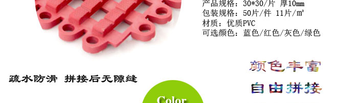 10109A/B/C/D--长城格疏水防滑垫采用的优质环保PVC材质,弹性好,脚感舒适 PVC材质的超强韧性,不会产生折痕,还可防止高强度的磨损和撕裂,安全 防滑.网状结构疏水设计,排水效果好 易于清理;耐磨、经久耐用 美化环境保护瓷砖、降低噪音、安装简易疏水防滑系列适用于工厂车间及商业厨房疏水防滑并且耐酸碱及耐油污、潮湿环境防滑疏水拼块适用于走道 阳台公共环境 防滑美化环境 保护瓷砖 降低噪音。